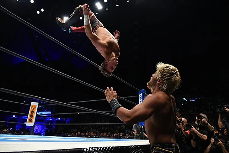 Начали исполнители с борьбы, причем как с цепной, так и на настиле, причем победителем из этой истории выходил Зак. Обмен биг бутами, и Сэйбр поймал чемпиона в Octopus hold, затем, уйдя от дропкика, применил European Clutch и перешел на Banana Split, однако Окада дотянулся до канатов. Далее Зак сконцентрировал атаки на ноге соперника, но Окада нашел ответ в виде связки из локтей и коронного DDT. Слэм от Окады, но чуть позднее Сэйбр поймал его в гильотину, которую Казучика перевел в коронный некбрейкер на колено. Слэм последовал и элбоу дроп с угла, Окада приготовился проводить Rainmaker, от которого Зак ушел. Но Казучика поймал его дропкиком и Томбстоуном. Второй выход на Rainmaker Зак перевел в Octopus hold, и с большим трудом Казучика дотянулся до канатов. Сэйбр принялся забивать соперника, но тот парировал PK и шарахнул дропкик. И снова Зак перевел Rainmaker в свой захват, затем парировал попытку Томбстоун и провел ещё одну вариацию Octupus hold. Казучика выбрался и провел спиннинг Rainmaker, чтоб добить визави окончательно классической вариацией своего лэриэта.