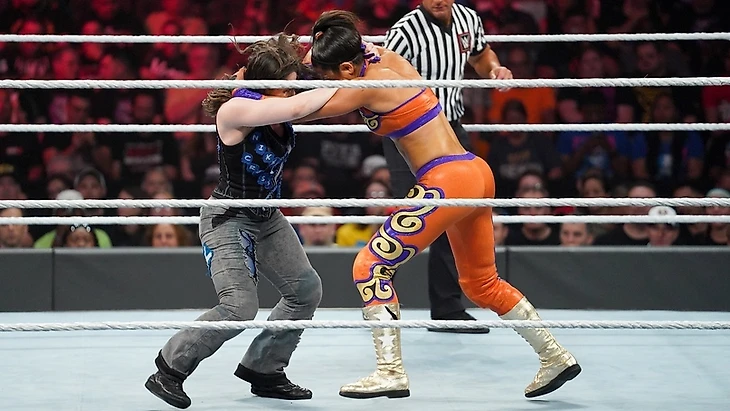 Обнимальщица сопротивлялась и словила бейсболл-слайд, после чего её вернули в ринг, и Блисс начала удерживать - два раза мимо. Смена тэг, и Кросс продолжила монотонное доминирование над оппоненткой, зафиксировав чемпионку в углу, пока Бэйли не начала отбиваться по-новой. Это стоило ей некбрейкера с угла и Insult to Injury от Блисс, после чего девушки вновь сошлись к размене приёмами и ударов - к тому же и Кросс успела получить суисайд-дайв между первым и вторым канатами, а Алексе станнер - удержание до 2. После этого чемпионка приготовилась добивать Блисс, но вмешалась Никки, и Бэйли пришлось сначала нейтрализовывать ей бэк-дроп драйвером, а потом гасить Богиню с помощью Кросс как снаряда для пауэрслэма. Далее чемпионка сумела зафиксировать что-то вроде обратной четвёрки на Никки, а уйдя от атаки Алексы - выловила последнюю и фиксанула на ней кроссфейс, но ненадолго. Блисс пришла на помощь Кросс и освободила от болевого, а Никки после избиения от Бэйли удачного провела в ответ tornado-DDT - удержание снова до 2, вторая попытка также мимо. Кросс в ярости, но отдаёт тэг Алексе и пошёл Twissted Bliss - прямо на колени, из-за чего передача тэга, но полёт Никки прерван коленом от Бэйли, которая быстро приготовила Никки к своему elbow-дропу — он и прошёл весьма успешно, с удержанием до 3.