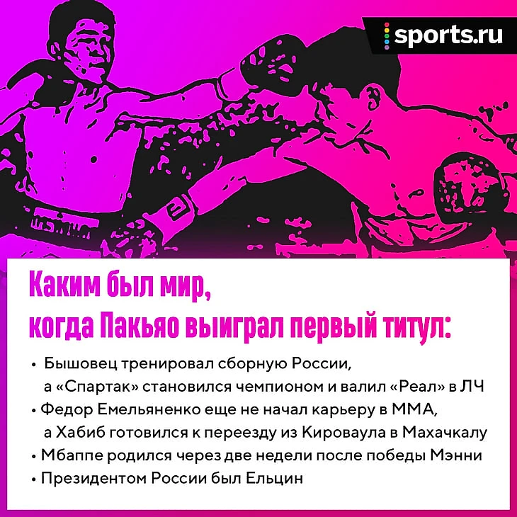 Первый титул Пакьяо взял в XX веке. Кличко считались перспективными, Ельцин правил страной, а «Спартак» не расставался с золотом