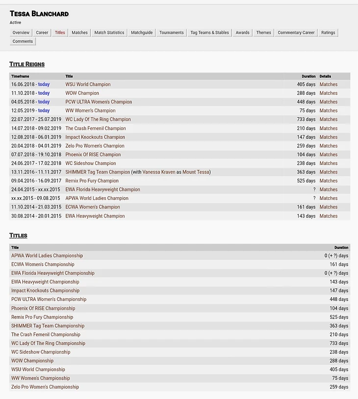 Такими маленькими, но революционными шагами она шла к вершине. К слову, о вершине. На данный момент Тесса владеет 4-мя титулами. Я не смогу и близко перечислить вам все ее титулы, так что просто посмотрите на них и на то, сколько она их носит: