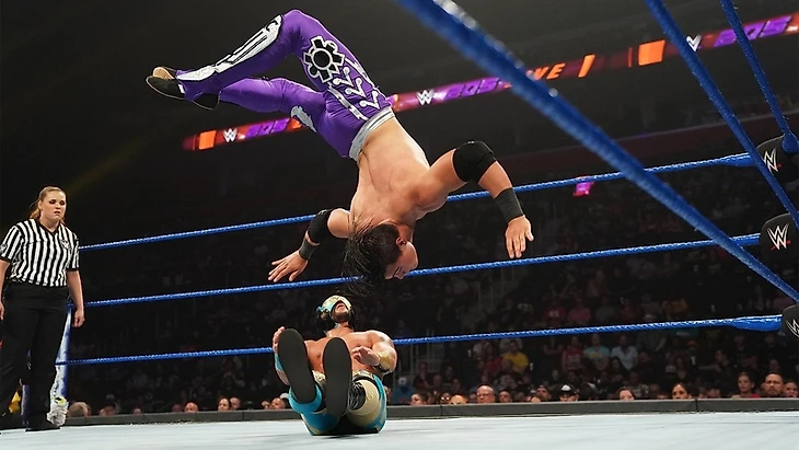 Все рестлеры были готовы к большой бойне, но тут заднюю решил дать именно Дайвари. И поплатился за это - он получил суисайд-дайв от Тозавы, а следом получил по удару, панчу и чопу от каждого из пяти прочих участников матча. Следом иранца загнали в угол и пробовали атаковать по командам - Ария отбился бутам и тем самым загнал всех в кучку в центре ринга для своего воздушного мува. И он...не попал в цель, так как рестлеры спокойно разошлись по сторонам (было смешно видеть такое падение, вот вам и ДЕДОВЩИНА). Вскоре остальные рестлеры разбились по парам - Калисто-Лоркан, Низ-Тозава и Галлахер-Дайвари на ринге - и принялись разбираться друг с другом, что было сложно контролировать (как мне, так и рефери), но затем пошла большая заварушка и в дело вступил именно Низ - он принялся расправляться с Тозавой и Калисто. Акира получил в ходе стычки с Тони Rapid-Kick комбинацию, а вот Калисто оказался несколько более гибче и готовился к tornado-DDT на Низе - последний перехватил лучадора и готовился к большой контратаке, но просто выкинул Калисто в Тозаву, выбив обоих с ринга.