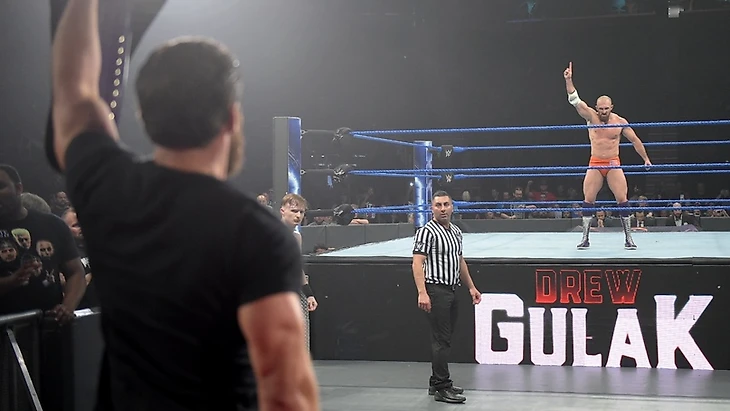 После столь непростого и богатого на интригу поединка к рингу прошёл сам чемпион бренда - казалось, что большой драки между двумя агрессивными бородачи дивизиона не избежать. Но в итоге Гулак решил не тратить свои силы впустую и просто попозировал с титулом в руках, Они же ответил ему своим жестом.