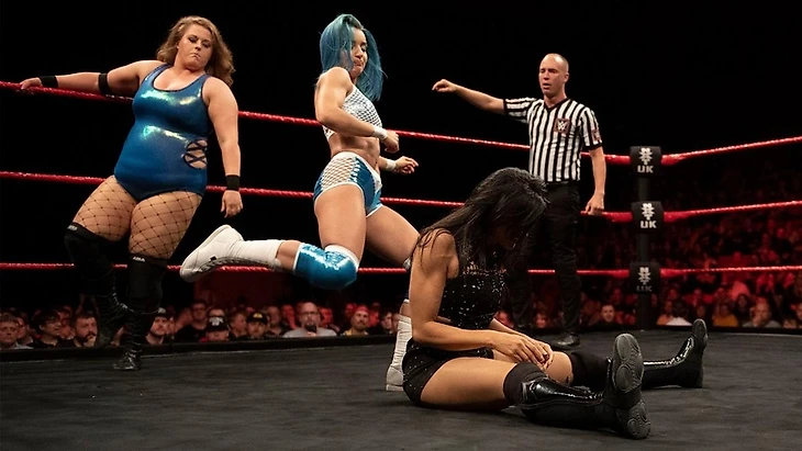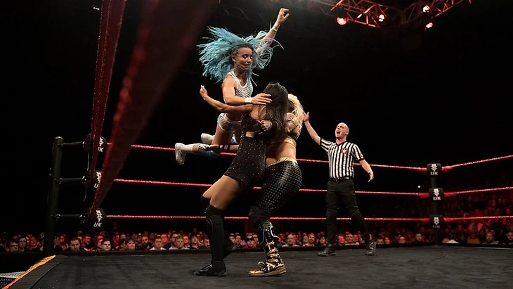 Этот матч мы уже видели в разных вариациях. В этот раз у Бруксайд был еще один шанс попытаться выйти на полосу удачи в этом противостоянии, и этот матч начала именно она, а на встречу ей вышла Джинни. Сая провела дропкик, несколько ударов и передала право ведения боя Нивен, которая задобрила Джинни сплэгем в углу. Тэг обратно Бруксайд, и она растеряла преимущество, получив харриканрану, несколько ударов и удержание до 2. Затем в ринге вышла ее мощная подруга, которая стала наносить мощные удары, провела слэм и вернула в матч Джинни. От нее уйти Бруксайд смогла, отправив в бой Нивен. Та буквально уничтожила оппонентку своими атаками и провела бакл бомбу. Право ведения боя забрала Гэберт, и «легальные» рестлерши устроили обмен ударами, в ходе которого Пайпер провела хэдбатт и раннинг кроссбади до 2. Тэг Бруксайд, и командная работа до 2. Джэззи отбилась от нее сайд слэмом, передала тэг Джинни, а на рингсайде появилась Риа Рипли. Она устролила бой с Пайпер Нивен, так что Сая не могла ни на кого рассчитывать. Джинни провела ей хай кик с ударжением до 2. Бруксайд ответила коудбрейкером, и пошел размен ударами, в результате которого Сая провела фэйсбастер и хэд сиззорс, а затем еще и двойные колени в спину в углу до 2. Джинни, находясь на плечах оппонентки сумела дотянуться до напарницы, передала право ведения боя… но Бруксайд полетела на обоих своим кроссбади с третьего каната. Особого урона Джэззи это не доставило, и она довела бой до победы связкой из лэриэта и Dominator.