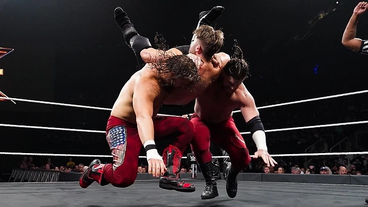 Не стоит забывать, что матчи с данного выпуска записывались ПЕРЕД TakeOver, а значит зрителей должны были грамотно подготовить к грядущему эпику. Немудрено, что сразу после интро на ринг поднялись любимчики публики в лице Фанданго и Тайлера Бриза, которые стараниями последнего оказались втянуты в неравное противостояние с Забытыми Сынами.