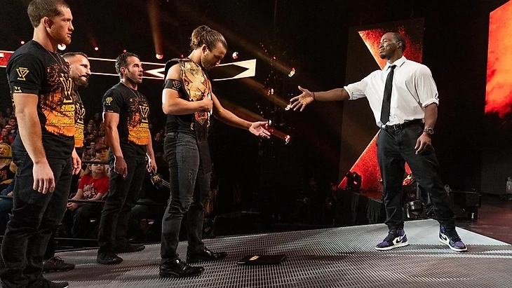 А пока ожидание главного матча нам решили скрасить члены The Undisputed Era, которые не смогли сдержать своего обещания по захвату золотого запаса NXT в Торонто, однако Адам Коул все еще Чемпион NXT, и пока этот факт неоспорим. Собственно, чемпион и начал речь, заявив, что он сделал ровно то, что и обещал - побил Джонни Гаргано и защитил Чемпионство NXT. Некоторые говорили Адамаске, что на ТО он выложился так, как не выкладывался никогда в своей жизни, так что теперь уж точно ни у кого не должно оставаться вопросов, кто лучший Чемпион NXT. Коул решил привести конкретный пример: он сказал, что если бы у бренда была собственная гора Рашмор, то на ней красовались бы не Гаргано, не Чампа, не Накамура и не Балор. О нет, только четыре красивых личика Адама. Родерик подыграл товарищу, но все же не упустил случая поныть на тему того, что они все должны быть чемпионами - и были бы, если бы их не подставили. Роди обратился к Вельветину Дриму с типичной хильской претензией: "ты лох и не удержал меня, а значит я буду тайтл-шотить хоть до второго пришествия". Кайл О'Райли похвалил Стронга за инициативу и в свою очередь не преминул пожаловаться на их с Фишем проблемы, указав на то, что на ТО Уличные Пророки удержали не того. Фиш поддакнул напарнику и буквально прохрипел, что они не проигрывали Street Profits в Канаде, указав на тот самый злополучный слепой тэг. На этом Печально Известный не остановился и вызвал на ринг болвана по имени Уильям Ригал. Коул, как истинный лидер, держащийся за лидерство всеми четырьмя, устроил троице неудачников поднятие боевого духа словами о том, что О'Райли и Фиш - величайшая команда в истории NXT, а Роди уже может считать себя Североамериканским Чемпионом. TUE в двух шагах от исполнения своего пророчества, а следовательно, в двух шагах от того, чтобы сделать это место истинно...неоспоримым. Проговорив это, Коул покинул ринг, за ним последовала его свита, однако на полпути их прервал выход Джордана, мать его, Майлса, вырядившегося в деловой костюм. Адам остолбенел от наглости победителя NXT Breakout Tournament и полюбопытствовал, уж не собирается ли тот выбрать именно его, Коула, в качестве своего соперника, а его чемпионство - в качестве приза за победу. Адамаска подметил, что он уже видел Джордана раньше и помнит его глупую ухмылку, которую он непременно сотрет с его лица, если тот и вправду решится тягаться с ним. По всей видимости, Коул зависает на Реддите, потому что он тут же предложил Майлсу альтернативу в виде матча с Шэйной Бэйзлер. Перебрав все возможные вариант, Плейбой из Панама-Сити заключил, что афроамериканец не по плечам ношу выбрал. Если Джордан вздумает ослушаться, то его карьеру, заверяет Коул, постигнет неоспоримый провал. И Джордан не послушался, он просто протянул Адаму подписанный контракт и...обронил его, стоило чемпиону протянуть руку. На том и разошлись.