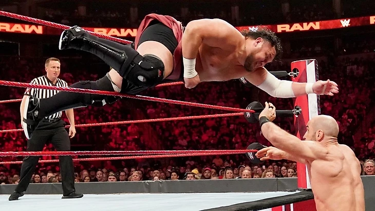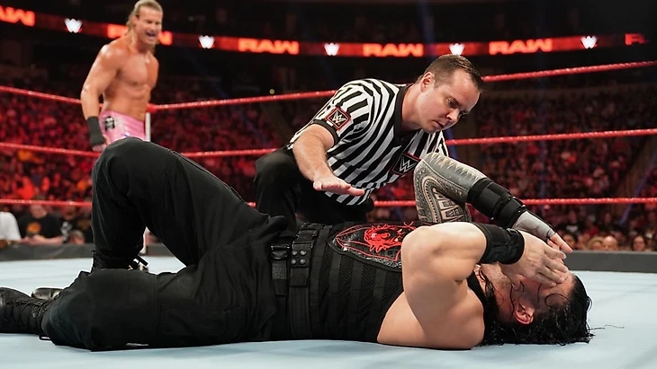 Красный бренд показал хороший, даже можно сказать добротный уровень, где хватило, как и долгих, так и скоротечных матчей. Хочется выделить два из них. С начала выпуска нас решили не мариновать долгими разговорами и отправили в бой выходцев из синего бренда: Романа Рейнса и Дольфа Зигглера. Подобно искусному фокуснику, выходец из Кливленда обхитрил своими репликами самоанца и неожиданно атаковал. Уже который раз приходится наблюдать интересную тенденцию, Большой Пес показывает хорошие матчи, когда подстраивается под стиль оппонента. Так и произошло в понедельник. Именно Зигглер управлял вектором боя, ускорял темп во время атаки вне ринга. А в нужный момент успокаивал одним движением, как в моменте с переводом гарпуна в фэймосер.