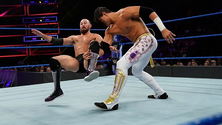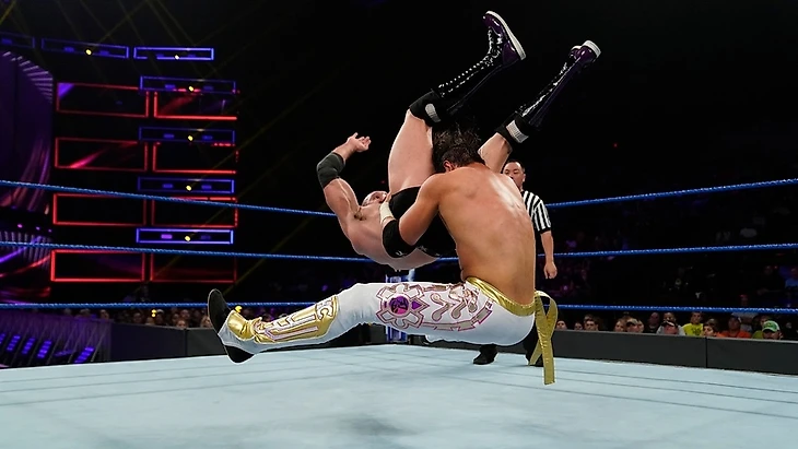 Дайвари, уже с третьей попытки, но решился перейти на измор своего оппонента захватами - Ария хотел играть по своим правилам, ему надоело стараться угнаться за лучадором. Бывший чемпион полутяжей продолжил сражаться за то, чтобы не дать подлому иранцу взять вверх - Калисто предпринял попытку контратаки от канатов и...нарвался на жёсткий спайнбастер - удержание до 2. Дайвари был недоволен ситуацией и продолжал оказывать силовое давление на отважного лидера LHP, который не намеревался останавливаться в попытке одолеть иранца - Калисто сумел снова нанести град атак на Дайвари и даже не оставил ему пространства для ответа, влепив running-хуррикенрану - удержание до 2. Ария сразу решил уйти в сторону, и борьба переместилась на апрон и между канатами. Калисто переиграл Дайвари с помощью энзигири и второй хуррикенраны, сбросив Арию с апрона. Начался отсчёт рефери, а рестлеры были уже измотаны - Калисто сумел вернуться в ринг с Дайвари на счёте 9 и решил повторить свой воздушный манёвр - он атаковал Дайвари 450-сплэшем, но во время удержания случайно положил ноги Арии на канаты (если честно, я даже не знаю, что это было, но вышло забавно). Бывший чемпион 205 Live готовился заканчивать бой своим Salida del Soul, но Дайвари сразу же схватился за маску Калисто, и пока последний разбивал захват, Дайвари быстро перехватил лучадора на Hammerlock Lariat и удержал Калисто до 3.