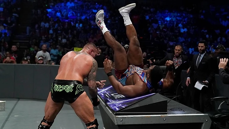 Вторым со знаком плюс, можно отметить бойню между Ортоном и Биг И. Это было быстро но, что наиболее важно эмоционально. Член Нового Дня шел мстить, сокрушать Верховного Хищника. Получилось интересно, мы увидели фирменные комбо-суплексы Лэнгстона, давление на конечности Рэнди, и кража коронных приемов придали противостоянию красок, которых явно не хватало в понедельник вечером. Финал идеален, в нужный момент к Гадюке примкнуло Возрождение, где мы вновь увидели некую форму 3D.