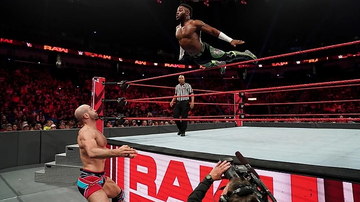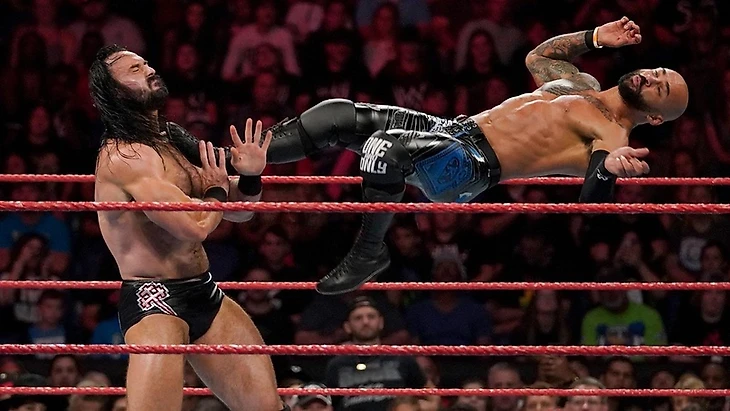 Красный бренд долго запрягал лошадей, слегка убаюкивал сегментами и заумными речами о «Короле Ринга», но преподнес нам вкусный пир. Первым блюдом оказалось противостояние Дрю МакИнтайра и Рикошета. Без раскачки они ринулись в бой. На правах более крупного противника шотландец захватил инициативу, фирменные суплексы и чопы выглядели мощно. За пределом ринга был паритет, именно там хайфлайер мог разгуляться вдоволь и обрушить скоростные атаки, одна такая обернулась ошибкой. Вылилось все в бэк суплекс на заграждения.