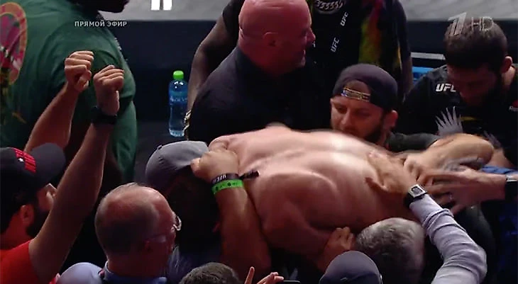 Хабиб Нурмагомедов победил Дастина Порье удушающим приемом в главном бое UFC 242. Сразу после того, как судьи зафиксировали результат, Хабиб снова рванул из клетки в зал – обниматься с отцом и командой.