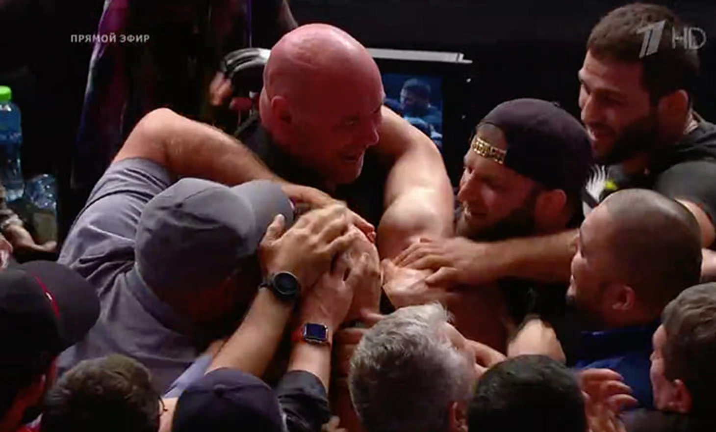 Перелетев клетку, Хабиб побежал обнимать свою команду. К ним неожиданно присоединился босс UFC Дэйна Уайт.