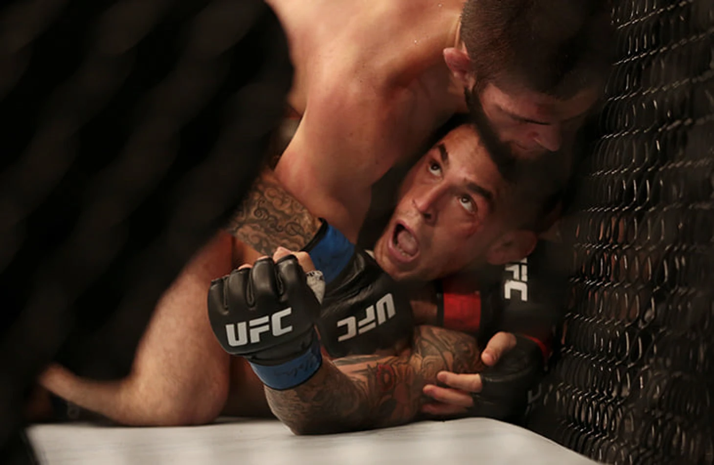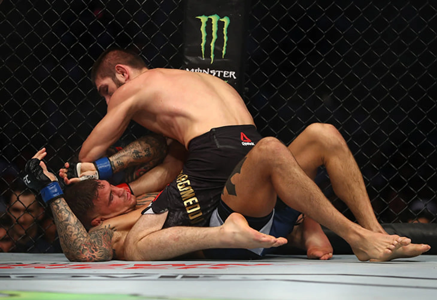 В этот момент круто проявил себя Хабиб: левой рукой он сбрасывал ту самую ногу Дастина, а сам смещался от нее по часовой стрелке, и лишая соперника контроля, и обеспечивая себе лишний кислород.