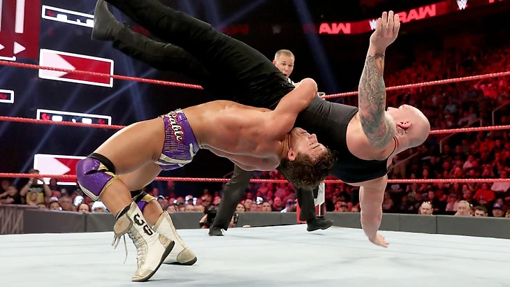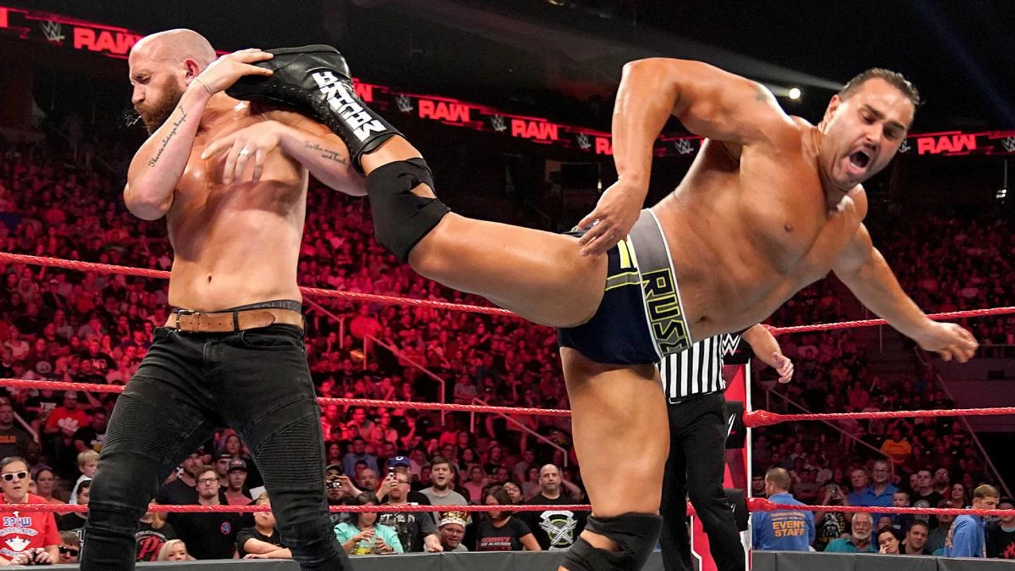 Майк сразу постарался напасть на Рикошета, но тот пару раз увернулся. Причем Рикошет пытался объяснить, что Мария соврала. Но ему это скоро надоело, поэтому ловите: суперкик, таран в углу, кик, спрингборд клоузлайн и коудбрейкер. Легкая победа Рикошета. После Мария вышла со словами, что уже не знает, как мотивировать Майка. Поэтому сейчас он встретиться с настоящим настоящим отцом ребенка. Кто бы это мог быть? Это Русев! Майк явно не ожидал такой подставы. Впрочем, он сказал, что не против, что отец — Русев, даже поздравил его и попытался сбежать, но это не сработало. Бросив Майка во все, что возможно, за рингом, Русев отправил его на ринг, где познакомил со своей шикарной болгарской обувью, а затем запер в акколаду, от чего Майкл и сдался.