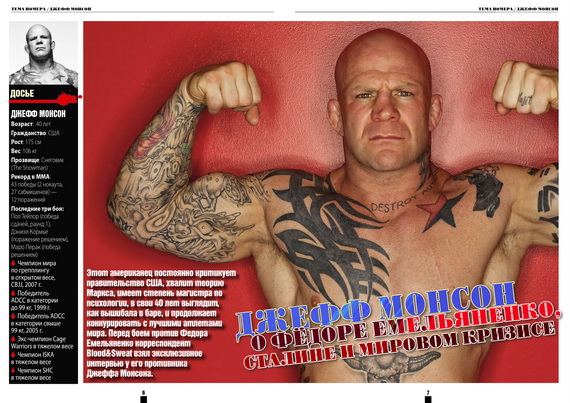Предваряя московский поединок легенды ММА Федора Емельяненко, Blood&Sweat посвятил главные материалы ноябрьского выпуска журнала сопернику русского бойца Джеффу Монсону. В эксклюзивном интервью Blood&Sweat Монсон рассказал о своем отношении к будущем оппоненту и России в целом, поделился соображениями о том, как противостоять власти крупных корпораций, оценил личность Иосифа Сталина и продемонстрировал нам свои многочисленные татуировки.
