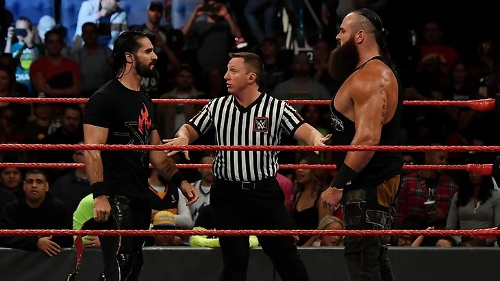 Перед матчем у Сета взяли интервью по поводу того, что следующим претендентом на чемпионство стал Мистерио. Роллинс отдал должное Рею, сказав, что это матч мечты для него, однако, мысли о грядущем матче с Броном и с Уайаттом на Hell In A Cell не дают ему возможности особо расслабляться. Сейчас ему нужно думать не только о Рее, а обо всем сразу. Но, такова цена чемпионства. И все эти матчи он переживет и превзойдет своих соперников в них. Начал чемпион матч с лоу кика, но уже следующую попытку кика Строумэн предотвратил, нанеся жесткий панч. 2 жестких шоулдэр тэкла прошли, от третьего Роллинс ушел и поймал Брона в слипер, но тот сбросил оппонента с себя, шарахнув удар в грудь. На время «монстр» завладел контролем, но «Архитектор» отбился дропкиком в колено. Неудачная попытка Педигри, и Сет оказался за пределами ринга. Попытка шоулдер тэкла на рингсайде, Роллинс ушел от него, но все равно продолжил страдать. В ринге попытку атаки в углу Сет сначала встретил ногами, а позже направил визави в стойку ринга плечом, добавив несколько атак ноги о рингпост. Колено в затылок с каната, суперкик, и лишь до 1. Вновь слипер, и вновь Брон отбился, чтобы влететь в суперкик и получить блокбастер. Удержание, лишь 2. Чемпион Вселенной добавил 2 фрог сплэша, и опять только 2. Подготовка к Блэкаут, и Строумэн почти поймал оппонента на пауэрслэм. Сет же отправил его за пределы ринга, провел 2 суисайд дайва, и третий Брон перевел в чокслэм на апрон. Коронный шоулдер тэкл, еще один, но оба раза Роллинс понимался на ноги… видимо, чтобы получить пауэрслэм на рингсайд. «Монстр» вернул свою жертву в ринг, приготовился провести еще один слэм, но тут свет на арене стал гаснуть, окончательно погас… и когда появился хоть какой-то свет, мы увидели, как «Fiend» замучил Брона своей mandible claw. Затем он пополз в угол к Роллинсу, и тому было как-то очень страшно. Строумэн попытался воспрять и ответить бывшему «отцу», но тот добил его своей mandible claw. Матч, очевидно, закончился дисквалификацией Сета. На смехе Брэя шоу вышло из эфира.