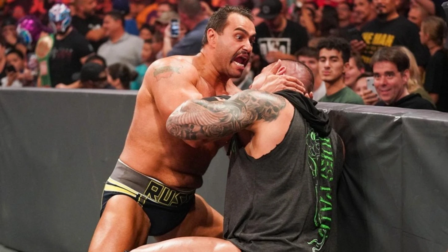 После хайлайтов матча Сета Роллинса и Брэя Уайатта, к рингу после анонса Джерри Лоулера вышел Тайсон Фьюри — один из лучших тяжеловесов на сегодняшний день, бывший чемпион мира и действующий Интерконтинентальный чемпион WBO, если я ничего не путаю. Лоулер задал «Цыганскому королю» вопрос о том, что же, по его мнению, произошло на SmackDown. Тайсон практически слово в слово повторил то, что сказал ранее за кулисами. Естественно, после слов «я требую извинений» заиграла музыкальная тема Строумэна. «Монстр» напомнил, что он просто прикалывался, и по взгляду Тайсона, Брону показалось, что тот тоже хочет стать частью движухи на SmackDown, поэтому Строумэн «отправил ему Дольфа Зигглера как подарок». Также Брон сказал, что когда охрана выводила Фьюри с арены, «монстр» убеждал их отпустить «Цыганского короля», ибо был совершенно уверен, что справиться с боксером в честном бою. Подытожил все это дело Строумэн словами «ты ко мне не лезь, я буквально пообедаю тобой». На что Тайсон ответил, что это хорошо, что охрана справилась с ним, ведь в противном случае, он бы нокаутировал Брона. Строумэн парировал тем, что на самом деле, это бы он отправил Фьюри в нокдаун, да так, что тот вспомнил бы бой с Уайдером. Тогда Тайсон напомнил «Монстру», что является чемпионом мира в тяжелом весе. «А сколько титулов в тяжелом весе выиграл ты, Брон?» — после этих слов мужики приблизились друг к другу, Тайсон толкнул Брона, Строумэн оттащил Фьюри в угол, будто тот ничего не весит, мужики сцепились, и охрана, которая присутствовала на рингсайде стала их разнимать… но здоровяки снова сцепились. Их снова разняли, и тогда они избили охрану, и снова сцепились. Тогда уже вся раздевалка WWE вышла их разнимать, и, раза, наверное, с пятого, Брона все-таки увели за кулисы. В интервью после стычки Брон сказал, что Фьюри чертовски мощный сукин сын, но рано или поздно от Строумэна ему все-таки достанется. И никаких извинений он не получит. После этих слов «Монстр» вернулся на арену и продолжил драку, и их снова стали разнимать, а шоу вышло из эфира.