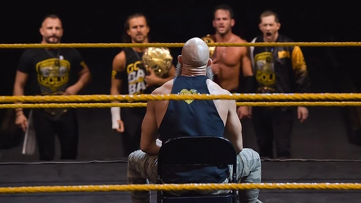 После матча Адам Коул призвал отдать должное Скотту, который был хорош, но, надо признать, даже рядом не стоит со Стронгом. Это Коулу и нравится в NXT: тут выступают лучшие из лучших. Именно поэтому Финн и Томмасо вернулись на прошлой неделе. У них есть мечта свергнуть Неоспоримую Эру с трона. Но этого никогда не произойдет. «Извините, кто-то упомянул Мечту?» — обратился с титантрона Вельветин Дрим. Затем свет на арене погас, и Дрим порадовал нас своим появлением на балконе, заслужив «горячую» реакцию толпы. Он завел речь о том, что в реальности некоторые члены Неоспоримой Эры действительно хороши. Но он решил обратиться не ко всей группировке, а индивидуально к Стронгу. Вельветин решил напомнить нам, какова сейчас реальность для Родди, показав ту самую фотографию голого чемпиона на диване с титулом, прикрывающим интимные места. Дрим напомнил, что через 2 неделе они сойдуться в титульном матче. И когда Вельветин вернет себе титул, мир увидит, что Родерик не дотягивает по калибру. После этих слов он показал отфотошопленное предыдущее фото, где титула нет, и очень небольшая зона фотографии заблюрена. Обладателя Североамериканского чемпионства это дело разозлило, но всем стало не до этого, когда к рингу двинулся Томмасо с костылем в руках. По пути он прихватил еще и стул, и, стоило ему ступить на ринг, Коул и товарищи любезно предоставили ему весь четырехугольник, а сами отошли на безопасное расстояние. Он был краток: «золотишко вернется домой к папочке».