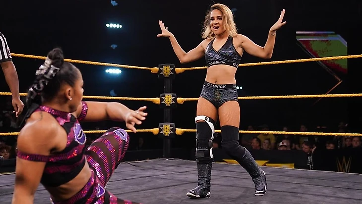 Начался матч с типичной борьбы за инициативу, из которой победительницей вышла Кай, улучившая момент для PK, двойного стомпа и РК с апрона. Удержание в ринге до 2, и Белэйр нашла в себе сыла на камбэк, отправив соперницу лицом в стойку ринга, добавив пару атак в углу и шоулдер тэкл до 2. Скуп слэм после пары приседаний, немного издевательств, и Дакота сумела свернуть соперницу, но только до 2, за что получила гатбастер. После рекламы мы увидели, как Дакота отбилась от соперницы сворачиванием, направив затем ее в угол ринга и добавив кик. Пара клоузлайнов, дропкик, bicycle kick на апроне и акс кик в ринге от новозеландки. Бут в углу с разбега, но удержание только до 2. Двойные колени, и снова до 2. В следующий момент Белэр уже отбилась, но вновь попала под сворачивание, и уже в следующем эпизоде вышла на комбинацию из implant buster и стрэндинг шутинг стар пресса до 2. На попытку пауэрбомбы Кай ответила очередным сворачиванием, затем провела еще одно, но оба до 2. Неплохой резмен между дамами, в ходе которого Бьянка поймала соперницу на KOD из неоткуда, которого хватила для победы. Взяв микрофон, она сказала, что слышала слова Рии Рипли ранее на шоу, но она не согласна, с тем, что Риа станет той, кто победит чемпионку NXT. Рипли сколько угодно может быть бывшей чемпионкой NXT UK, но если кто-то в NXT хочет добраться до Шэйны, для начала им нужно пройти Белэйр.