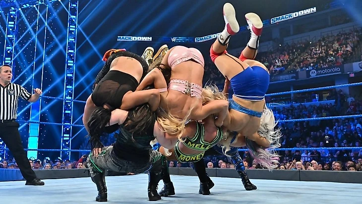 Дэйна Брук против Кармеллы против Лэйси Эванс против Никки Кросс против Мэнди Роуз против Сони Девилль – шестисторонний матч за претенденство номер 1 на женское чемпионство SmackDown.