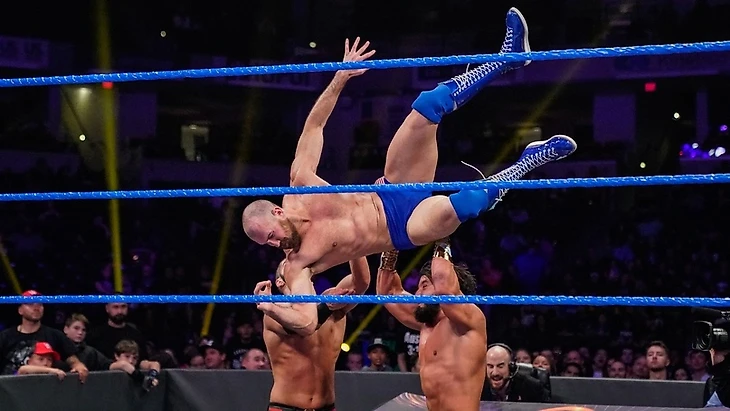 Вскоре Они и Тони сцепились в очной стычке между собой - Лоркан выбил Низа с ринга очередным апперкотом, только и Тони ответил, сбросив Они с канатов. Бывший чемпион 205 Live решил надавить на противника через болевой на голову и шею сразу, чередуя при этом удары, Лоркан пытался этому сопротивляться - как итог мат-слэм и попытка удержания от Тони, но только до 2. "Идеальный Атлет" снова пробует взять Они измором через болевые, однако последний сопротивляется. Ему удаётся отбиться, и тут сразу же на огонёк залетает пташка с Востока (Ария), скидывая Тони в сторону и атакуя reverse-DDT - удержание только до 2. Дайвари не останавливается, обрушивая град ударов на Лоркана (как отсылку к истории их противостояния) и готовясь атаковать со второго каната - не срабатывает из-за ответного апперкота от Они. Правда и Лоркан не успевает закрепить успех, вмешивается Низ и своим нижним разящим коленом дезориентирует оппонента. Кратчайший размен между рестлерами и попытка удержания от Тони, но снова до 2. Дайвари решает успокоить Низа и предлагает снова начать действовать вместе, ругаясь при этом с фанатами, пока Низ забивает Они - в итоге оба с большой оттяжкой обрушивают Они двойным суплексом. Вроде бы у хилов уже есть преимущество и даже пятюни выдали друг другу, но Ария всё никак не хочет делиться плодами совместной работы - он снова атакует Тони со спины, показывая свою подлую натуру во всей красе.