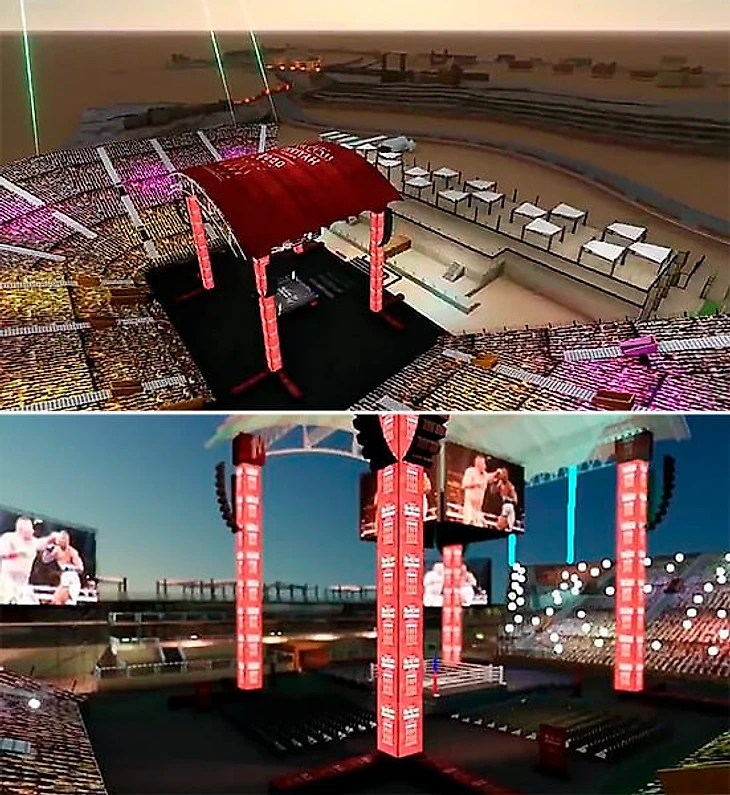 Проект стадиона был представлен 10 октября. Трибуны возведут с трех сторон, а четвертую займет сцена. За ней – раздевалки, VIP-места и телестудии. Над рингом будет специальный козырек и большой куб с трансляцией, а по бокам от сцены – два огромных экрана.