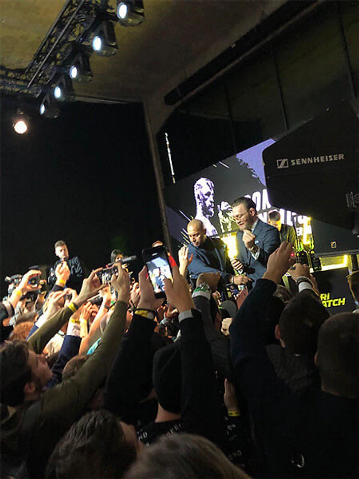 Журналисты ждали его в Telegraph Hall больше двух часов. Говорят, что Конор долго пил кофе. Может, поэтому и встретили его не так оживленно, как на улице.