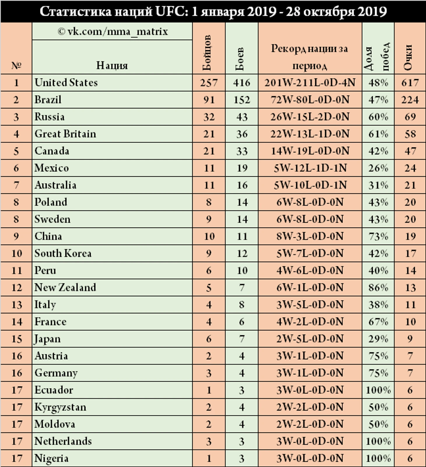 США - 617 баллов. 416 боев проведено 257 бойцами. Успешность 48%.