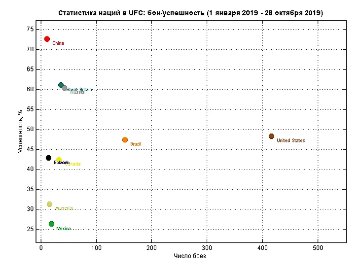 Для десяти ведущих наций число боев и успешность бойцов наглядно нанесены на диаграмму. Чем дальше маркер от левого нижнего угла на графике, тем лучше.