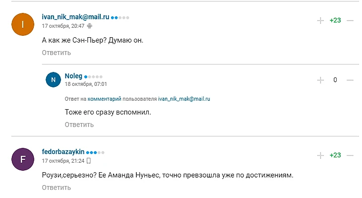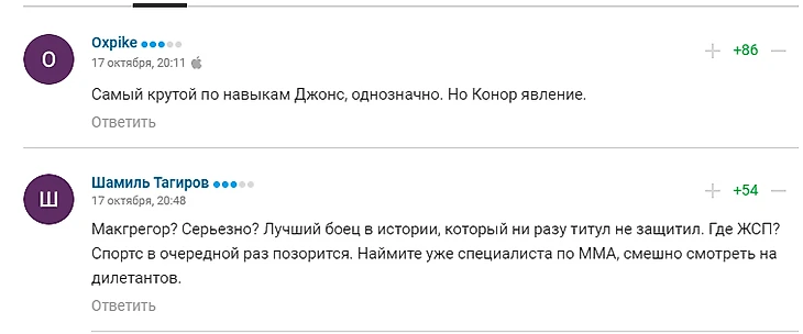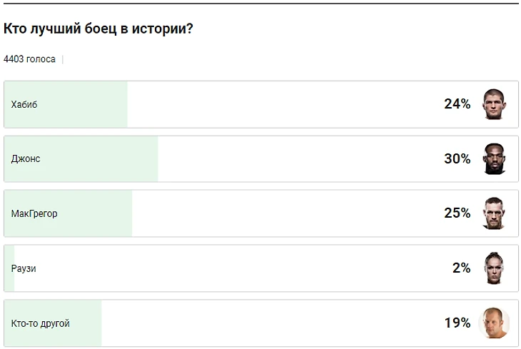 В середине октября авторы и пользователи Sports.ru выбирали лучшего бойца в истории. По итогам опроса вы назвали лучшим Джона Джонса: он получил 30% голосов, опередив Конора Макгрегора (25%) и Хабиба Нурмагомедова (24%). Ронда Раузи набрала всего 2% голосов, еще 19% выбрали вариант «Кто-то другой».