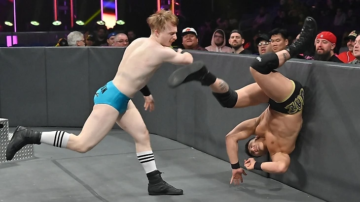 Следом он также удачно атаковал Дайвари суплексом и jumping-флэтлайнером - но удержание снова только до 2. Дайвари пытался снова перейти в атаку, сбив Скотта бутом, а в итоге получил связку из дропкика, суперкика и jumping-DDT с угла, однако и после этого удержание не прошло. Мистер "Swerve" был готов для проведения своего Swerve Stomp - тут Дайвари пришёл в себя, атаковал суперкиком и всё же провёл Gorlonoco-слэм, но и тут отсчет только до 2. Начался быстрый размен между рестлерами с попытками сворачиваний - окончился он перехватом лариата от Скотта в uranagi-слэм от Дайвари, удержание опять было до 2. Пошёл новый размен на скоростях, и оппоненты также быстро атаковали друг друга клоузлайнами. Далее Дайвари пришёл в себя и начал рубить словесную атаку на Исайю, а последний не церемонился и оттеснил Арию с ринга на апрон - там иранец получил суперкик и Swerve Stomp с апрона на пол. Казалось что Скотт готовился к воздушной атаке - и тут Ария опередил оппонента, проведя overhead-суплекс со второго каната. Правда и Дайвари зафейлился с diving-хэдбаттом - Скотт ушёл с линии атаки и тут же атаковал Арию jumping Axe-Leg киком в эту самую голову, удержав иранца до 3.
