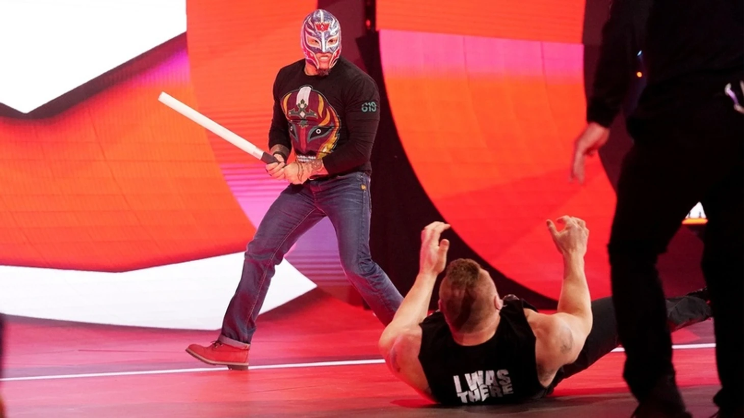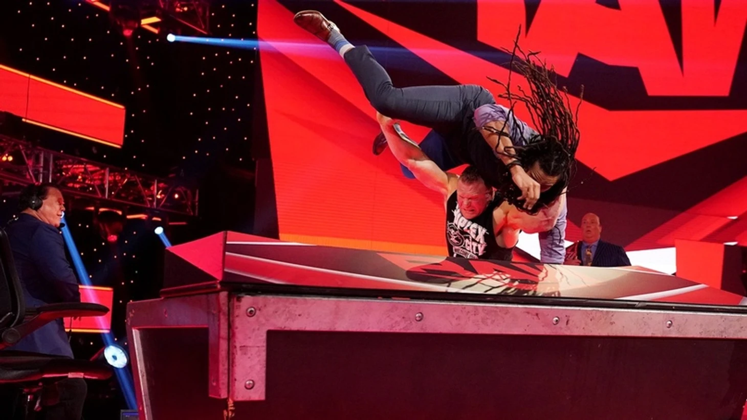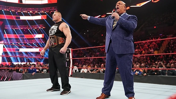 - Непосредственно после женского матча, Хейман и Леснар вернулись и подошли к комментаторам шоу. Пол стал задавать только вопрос - где сейчас Мистерио? И тут же переключился на Джерри Лоулера, задавая тот же вопрос и чуть ли не угрожая "Королю" организовать ему второй сердечный приступ руками Зверя. И если Лоулер продолжил сохранять спокойствие после таких слов - то его коллега Дио Мэддин нет, за что и получил F-5 на стол. На этом шок-моменты не окончились - Мистерио отозвался на призыв Хеймана и атаковал Леснара битой, причём именно под ногам Брока, а затем, после удара по голове титулом Брока, покинул рингпост (Вот вам и следствие как и промо в начале выпуска, так и всего противостояния между лучадором и Зверем - и это только начало);