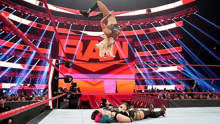 Начали бой Сэйн и Нэтти - начали с краткого лок-апа и на нём же по сути закончили, особенно после бодислэсма от Нэтти с каруселькой для Каири. Вскоре вышла Аска и попыталась навязать оппонентке более активной и силовой стиль борьбы - Аске практически удалось взяться за лодыжку оппонентки, но полноценного Ankle Lock не вышло, а затем Шарлотт взяла тэг у Натальи. Здесь уже обе попытались пересилить друг друга, пока не вмешалась Сэйн - против неё вышла Нэтти и вместе с Флэр выбили японок с ринга синхронными snap-суплексами. После рекламы Наталья и Аска продолжили бороться между собой - инициатива была в руках японки, однако далее те стали проверять друг на друге свои плечи. Тут никто не взял верха и Аска выманила Нэтти (избежав финишера последней) на рингсайд и подловила на хай-кик - удержание не прошло до 3 и Аска тут же фиксанула болевой (попутно нам показали события прошлой недели между японским дуэтом и их уже бывшим менеджером Пейдж).