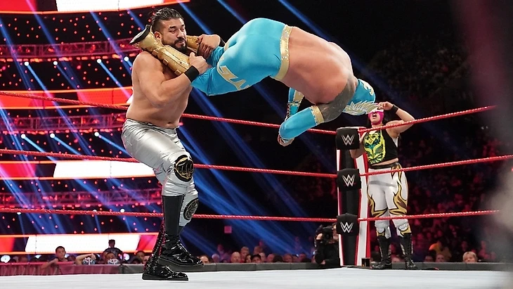 Андраде тут же кинулся на Кару - и вылетел с ринга. При этом лучадор готовился к полёту - Вега его отвлекла, как и рефери, на себя. И этим как раз воспользовалась Каролина - она атаковала Андраде cannonball-сэнтоном и дала преимущество для Син Кары. После рекламы оба рестлера были уже без сил, а нам показали моменты во время рекламы - точнее стычку между Зелиной и Син Карой, в которой последний получил связку из мунсолта и tornado-DDT. Постепенно рестлеры пришли в себя и Андраде оттеснил лучадора в угол - там пошла позиционная борьба, даже приняла критический оборот, но в итоге Син Кара провёл sunset-flip бомбу и получил шанс отдать тэг. В итоге Каролина провела пару дропкиков и кроссбади с угла - Вега выдержала напор и чуть не сорвала маску с лучадорки (как и Андраде ранее), оттеснив её в угол и атаковав киком от канатов.
