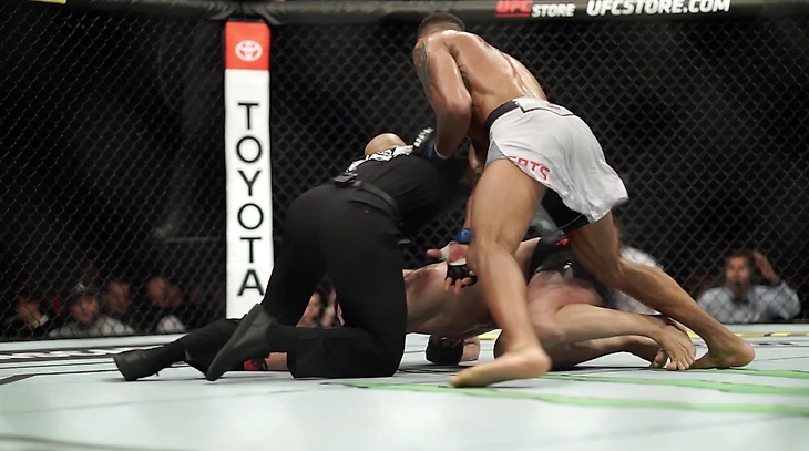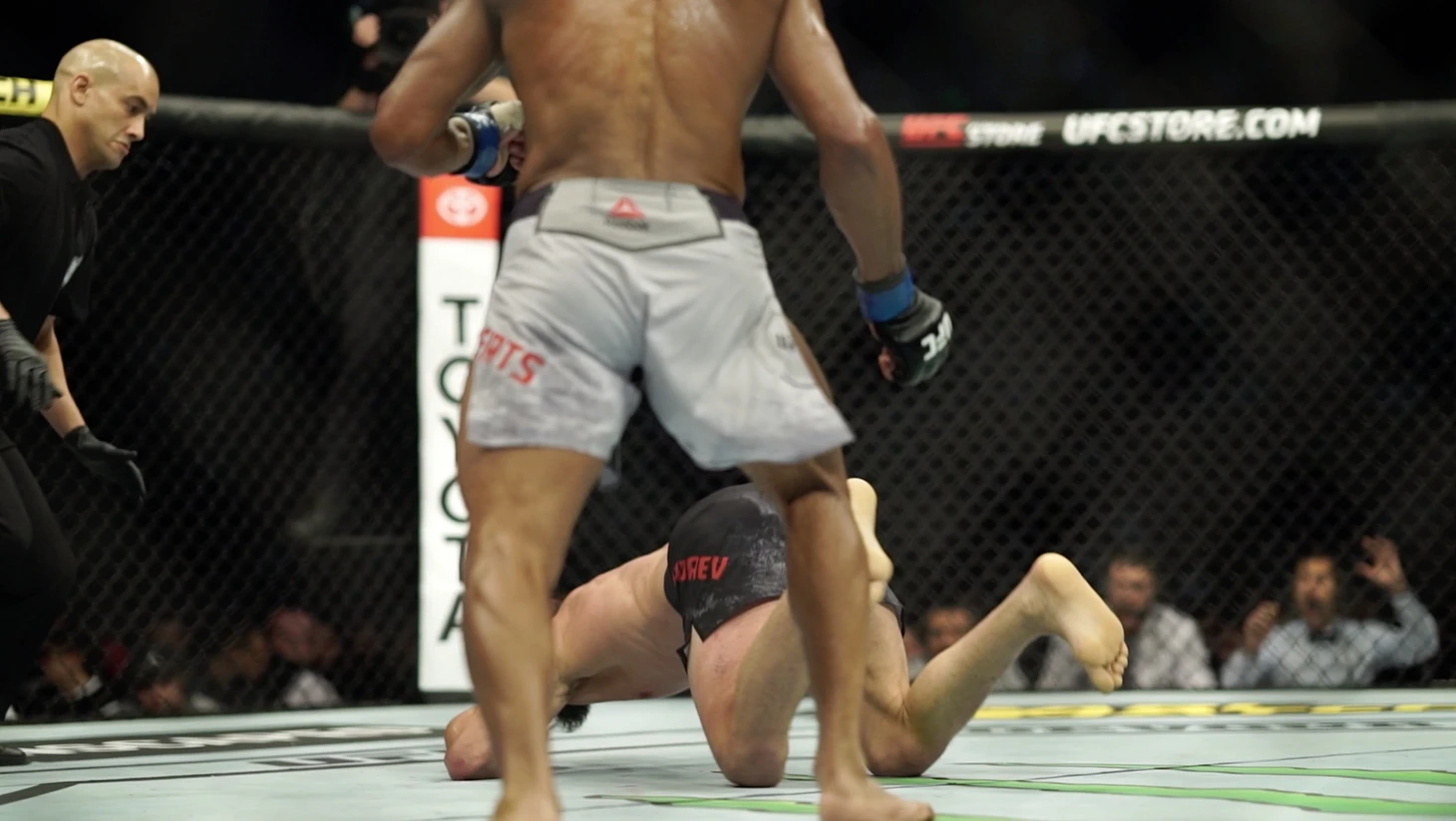00:10 Дэнни Робертс вроде проигрывал-проигрывал, а за несколько секунд до конца второго раунда просто вырубил Имадаева! Очень яркий нокаут, точно слева в челюсть!