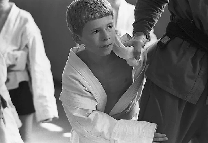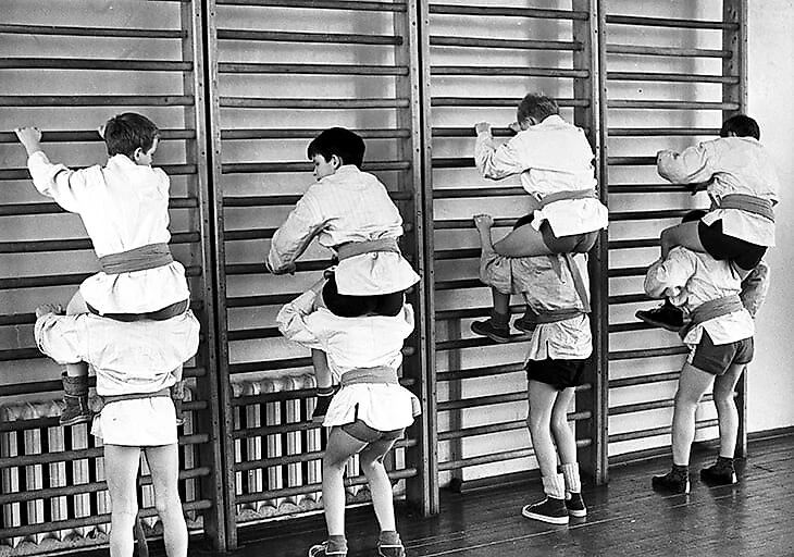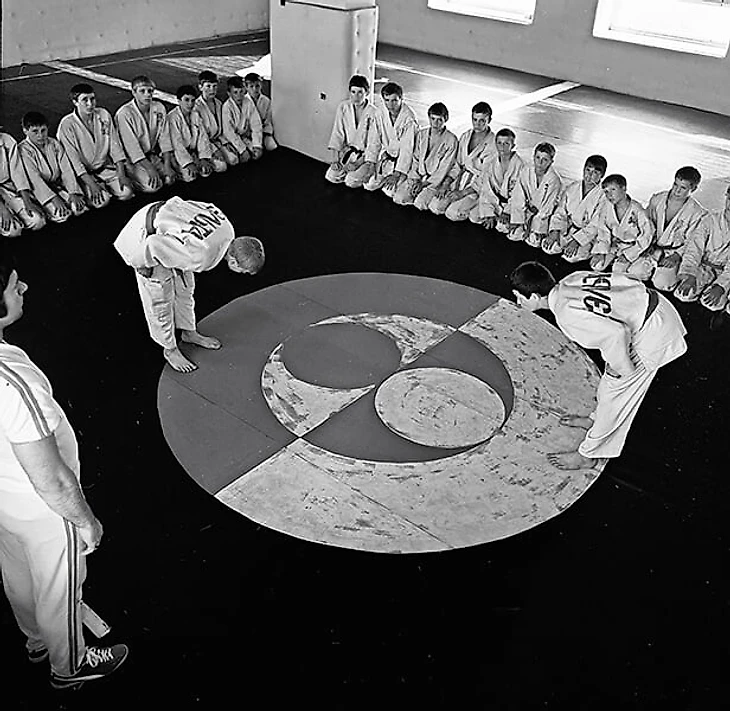 1975-й. Ученики детской школы самбо «Спарта» города Елец начинают тренировку традиционным поклоном.