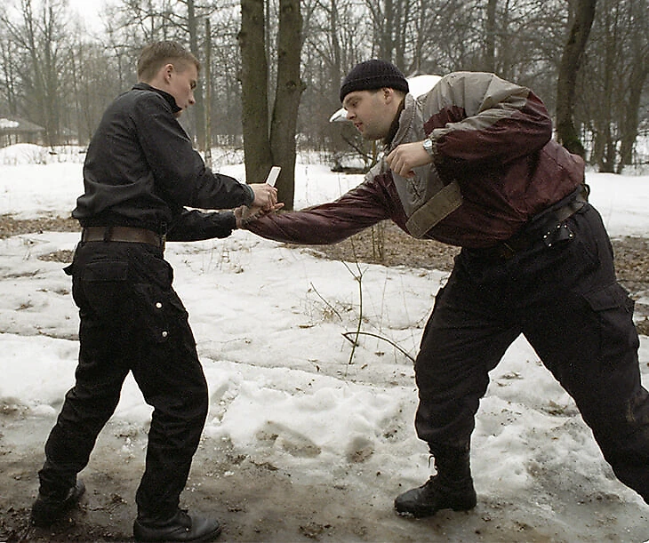 Обучение в коммерческой школе безопасности «Каскад»: будущие охранники отрабатывают приемы самбо.