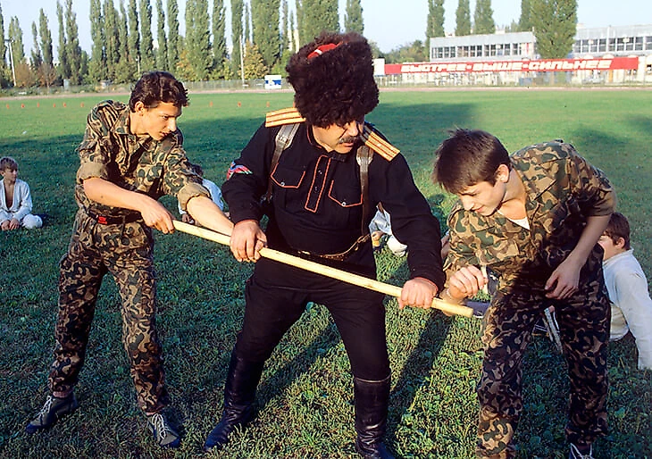 1991-й. Войсковой старшина Кубанской казацкой рады по физической подготовке Николай Помогаев обучает молодых казаков боевому самбо.