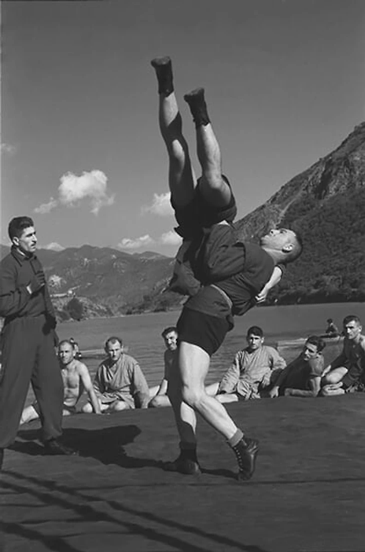 Основа спортивного самбо – дзюдо, то есть бросковая техника и болевые приемы. При этом в дзюдо запрещены болевые на ноги, а в самбо нет удушающих. Форма самбистов: шорты, специальная куртка и обувь. Вот так выглядели самбисты в 1953 году на тренировочной базе в районе Мцхетского озера в Грузии: