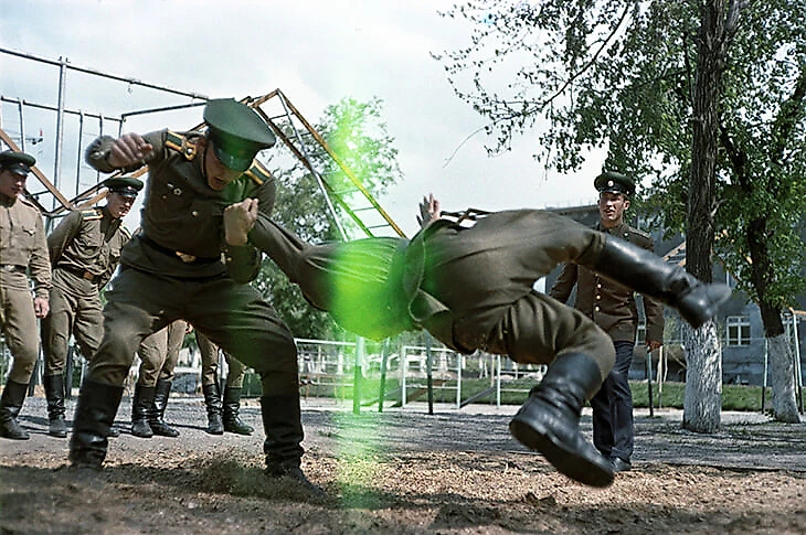 1970-й. Казахская ССР. Курсанты Алма-Атинского высшего пограничного командного училища им. Ф. Э. Дзержинского (сейчас Академия пограничной службы КНБ Республики Казахстан) отрабатывают приемы самбо.
