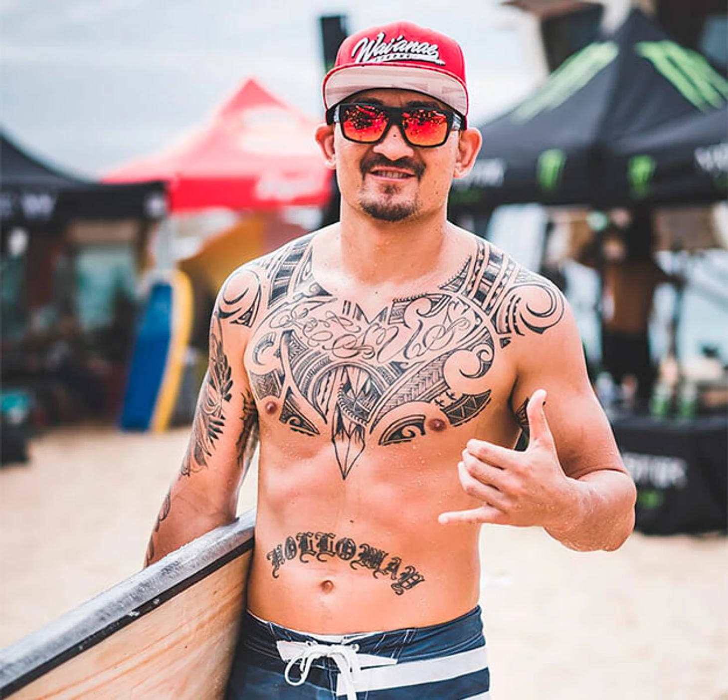 Действующий чемпион UFC в полулегком весе Макс Холлоуэй тоже не отличается скромностью, причем тату опять же на животе.