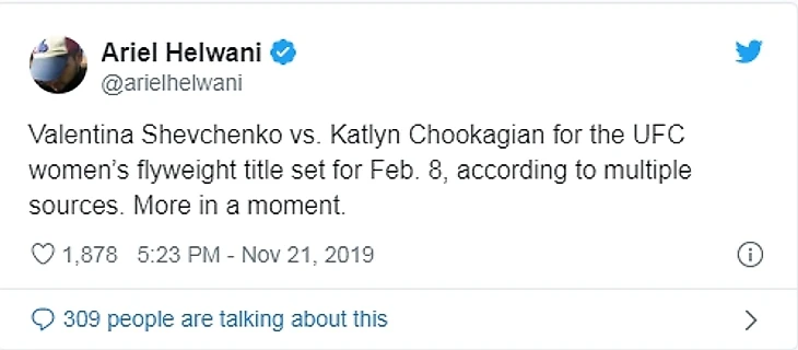 Чемпионка UFC в наилегчайшем весе Валентина Шевченко (18-3) получила новую соперницу. Как сообщает Эриел Хельвани, ссылаясь на собственные источники Шевченко проведет следующую защиту титула против Кэтлин Чукагян (13-2) 8 февраля на турнире в Хьюстоне, штат Техас.
