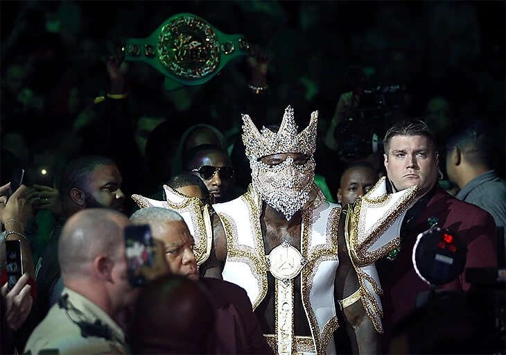 Выход в ринг Бронзового бомбардировщика был как всегда фееричным. Вызывающий наряд и маска-корона со стразами. Но с самого начала боя Уайлдер боксировал очень вяло: в первых раундах он не бил вообще. Лишь уходил от открытого размена ударов, который ему навязывал Ортис.