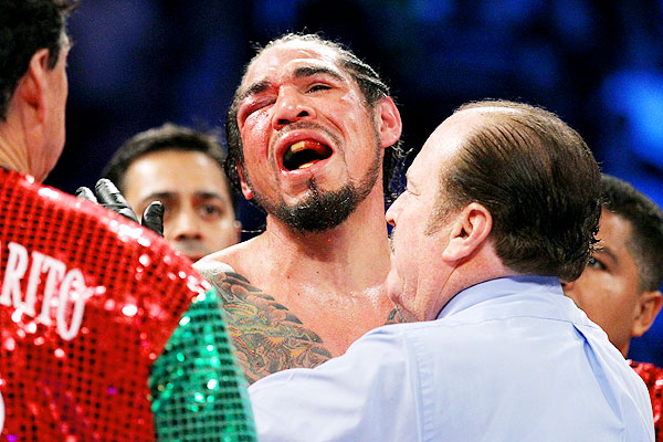 Тони улыбался в ответ и продолжал идти вперед. Со второго раунда Котто уже атаковал с ужасающе точным процентом – не попадая при этом почти под удары соперника. Маргарито собирал все на свою голову – и в третьем раунде из его правого глаза уже потекли кровавые слезы. Котто не был очень уж изощрен в выборе орудия мести, левый хук проходил в одну точку снова и снова. Он хотел нанести сопернику максимальный урон. В середине боя он начал замедляться, специально останавливаться, чтобы ударить жестче, больнее. В седьмом раунде он встал перед Маргарито, выпрямился и ударил его головой – не слишком грубо, но явно и по-злому, затем сразу, почти без паузы, нанес пару ударов после гонга и, развернувшись, отправился в свой угол. Жена Мигеля гордо улыбалась сквозь слезы и хлопала. Маргарито убеждал в углу Роберто Гарсию, что хочет продолжать.