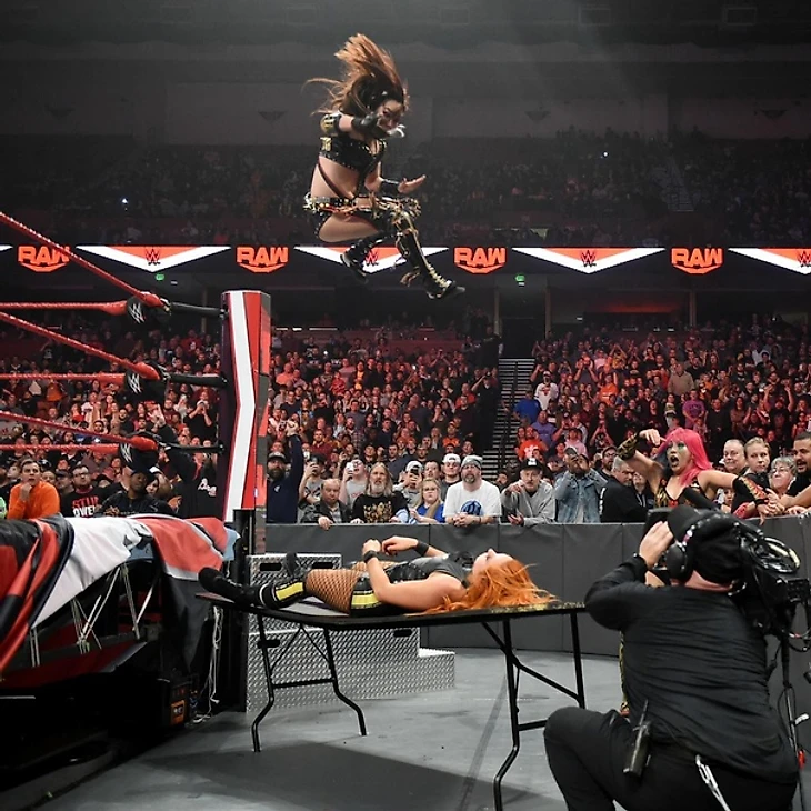 Во время выхода Линч Вик Джозеф напомнил нам, что Бекки Линч отказалась от предложения Рика(!) Флэра выступить в команде против командных чемпионок. Забавный ботч от комментатора. Начала матч против Бекки Аска, и ирландка без особых проблем завладела преимуществом, обрабатывая соперницу в углах ринга. Суплекс отправил Аску за пределы ринга. В результате Сэйн отвлекла Бекки, позволив Аске атаковать со спины. Какое-то время командные чемпионки доминировали. Бекки отбилась ударом предплечья от Каири, та отправила в матч Аску, но Линч и ее выкинула за пределы ринга, где отвесила пару ударов. Аска вернула тэг напарнице, и та попала под серию страйков женской чемпионки RAW, а потом она без особых проблем стала справляться с обоими японками. Эксплоудер Сэйн, затем двойной DDT командным чемпионкам, но лишь до 2. Линч забралась на угол ринга, однако Аска ее отвлекла, позволив Сэйн сбросить соперницу с угла ринга. InSane Elbow не прошел, как и миссл дропкик Аски, а Бекки зашла на экслоудер «Императрице». Легдроп правда у нее не удался, и угодила Линч в Аска Лок, и она сумела отбиться, поймав Аску в ее же коронный болевой. Сэйн спасла подругу, вытащив ее вместе с Линч с ринга, где Бекки познакомила Каири с баррикадой, а потом и Аску обрушила с апрона. Попытка удара предплечьем с апрона была встречена коленом Аски, и все три девушки упали на рингсайд без сил. Судья открыл отсчет, Каири попыталась сдержать ирландку, чтобы та не успела вернуться в ринг, но Бекки все-таки успела… тут же получив шайнинг уизард до 2. Обмен ударами между Аской и Бекки, у японки не прошел немецкий суплекс, но Сэйн помогла напарнице успокоить Линч, после чего прошла командная работа — Doomsday Device — до 2. Insane Elbow Линч встретила коленями, попыталась выйти на Dis-Arm-Her, но в бой попыталась влезть Аска, за что получила боттом (был небольшой ботч). В итоге, Сэйн все-таки оказалась в Dis-Arm-Her, но Аска вытащила ее за пределы ринга. Судья снова открыл отсчет, а девушки продолжили драку, и в ходе этой драки Аска огрела Бекки стулом, дисквалифицировав себя и партнершу. Под конец японки достали стул, уложили Линч на него, и Каири шарахнула InSane Elbow. Красиво.