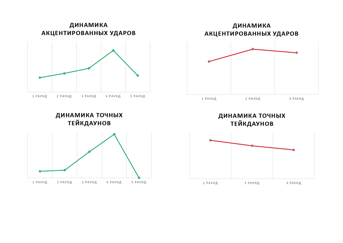 Акцентированные удары. Несмотря на то, что средний показатель Холлоуэя по количеству акцентированных ударов выше почти на 70%, их точность низка, и как следствие количество точных акцентированных ударов не сильно отличаются у бойцов. Более того, «коэф. нокдаун. силы» показывает, что на сотню точных акцентированных ударов Холлоуэй отправляет противников в нокдаун в два раза реже, чем Волкановски. То есть не смотря на специализацию Холлоуэя (боях на дистанции), Волкановски по факту ему не уступает. За все время выступления, Холлоуэй продемонстрировал широкий разброс количества ударов, в то время как количество ударов Волкановски держатся на стабильно высоком среднем уровне. Но во всей этой бочке мёда, есть и ложка дёгтя. Еще ни разу Холлоуэя не смогли отправить в нокдаун, в отличии от Волкановски. Наши расчеты показывают 42% на 58% в пользу Волкановски.