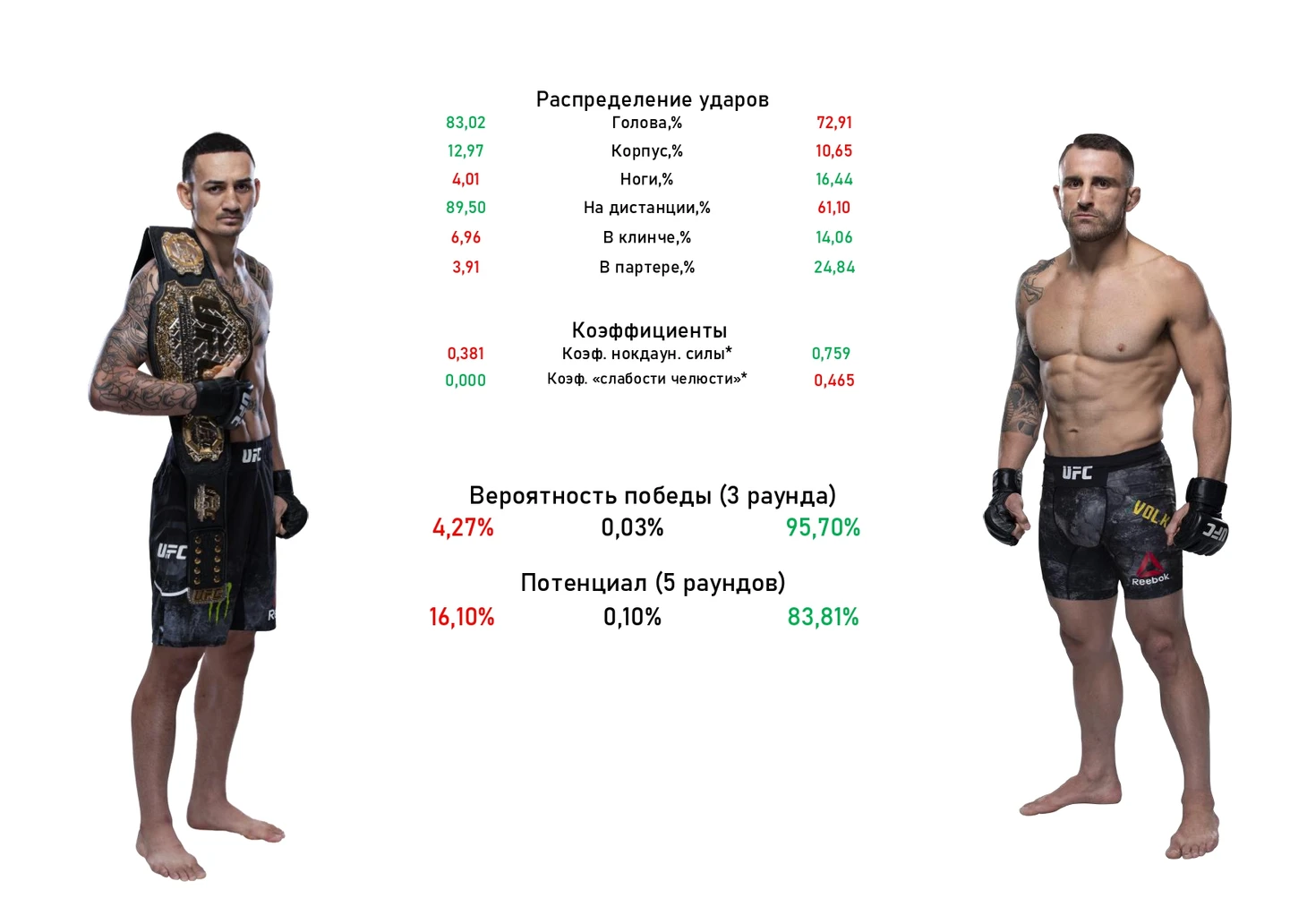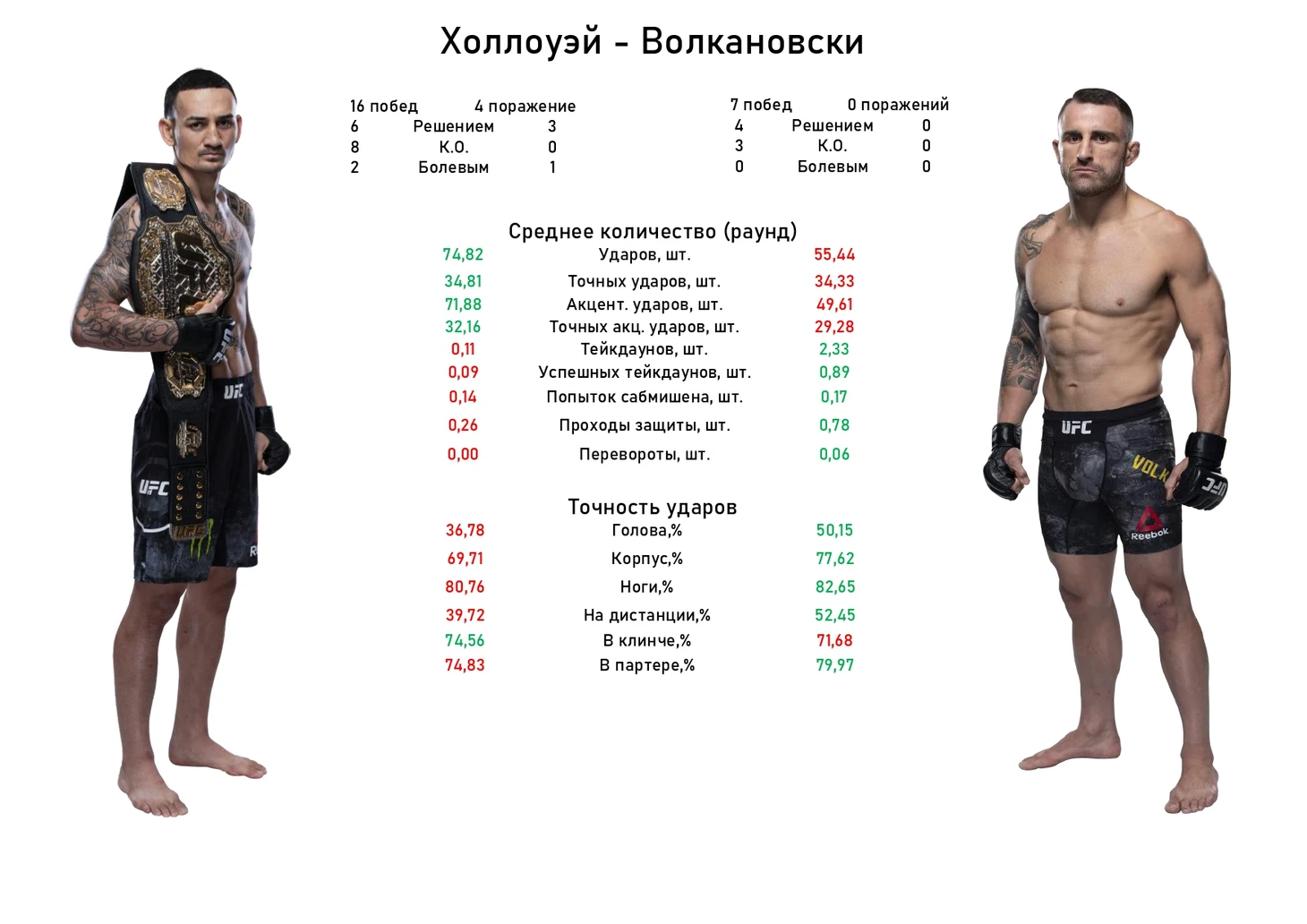 Вывод: В целом, как и было сказано в начале, почти по всем количественным показателям, которые мы подвергли анализу, Волкановски доминирует. Будь это 3-х раундный бой, можно было бы сказать, о его полном доминировании. Но бой продлится 5 раундов, а судя по динамике ударов и тейкдаунов Холлоуэй выходит на свой пик к 4 раунду, что увеличивает его шансы на победу. Говоря проще, если бой сведется к решению судей, из 1000 боев Холлоуэю присудят победу в 161 случае (10 боев сведется к ничьей). Но в тоже время, у Холлоуэя есть потенциал закончить бой досрочно, отправив Волкановски в нокаут или одержав победу сабмишеном, хотя такого в UFC с Волкановски еще не случалось.