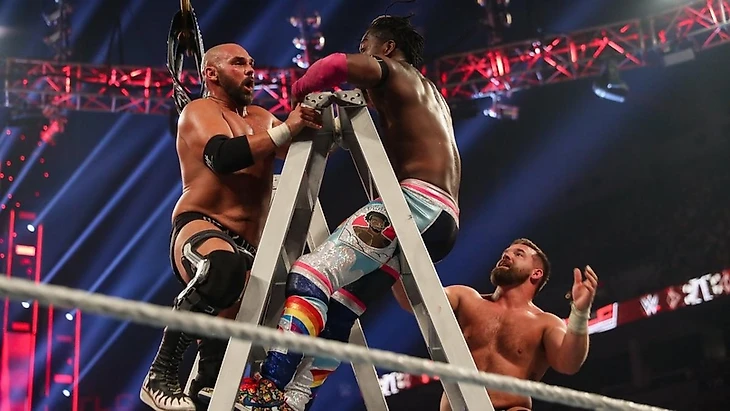 Начался бой с размена между всеми четверыми, и Новый День сумели сбить оппонентов с ног, проведя Дэшу командную работу, а затем еще одну. Кофи и Биг И отправились за лестницами, где и были побиты претендентами, пришедшими в себя. Но не успели Скотт и Дэш донести лестницы до ринга, как вновь получили от чемпионов. Доусона И вообще отправил в полет через комментаторский стол. И вновь Возрождение отбились, и Биг И улетел в стальные ступеньки, после чего Кофи был впечатан в LED-экран на апроне. Позже бывшего чемпиона WWE еще и лестницей утрамбовали в апрон, но от следующей атаки лестницей он ушел, полетев с канатов на соперников с лестницей, нанеся себе уроне не меньше, чем им. Затащить лестницу в ринге чемпионам не дали, и Кофи опять попал под атаки Доусона и Уайлдера, но Биг И атаковал их из ринга лестницей, а потом уложил Дэша на лестницу на апроне, попытался провести сплэш, и Скотт спас напарника, так что И приземлился ребрами на лестницу. Кингстон полетел на претендентов из четырехугольника, но его поймали и отправили лицом в эту же лестницу. Восхождение Возрождения к титулам по лестнице прервал И, проведя каждому по белли-ту-белли, но ему сорвать титуы помешал дропкик Скотта в лестницу. По ходу падения здоровяк жестко приземлился на ногу, а Revival еще и его детородный орган атаковали лестницей, проведя затем фэйсбастер на нее же. Кофи от этого же маневра ушел, провел серию атак, использовав лестницу как оружие, а Биг И заключил Скотта в Brock Lock. Уайлдер спас товарища, но Кингстон побил его и выкинул за пределы ринга. И снова Болевой на ногу Доусона, а Кофи его еще и лестницей огрел. Снять титулы, тем временем не получилось, но когда лестница падала, Кингстон сумел спружинить от канатов, проведя что-то вроде DDT Доусону, и нейтрализовав Уайлдера своим Trouble in Paradise. Снять титулы Доусон вновь не позволил, а потом Кофи и вовсе попал под Shatter Machine с канатов. Revival забраться на лестницу не смогли, ибо им помешал Биг И. Дэшу и вовсе достался гарпун с апрона на рингсайд. затащив в четырехугольник еще одну лестницу, И стал обрабатывать ей Скотта, установил ее в центре ринга рядом с первой, и отправил Доусона лицом прямо в нее. Позже третья лестница была установлена на угол и первую лестницу, а Скотт вернулся в бой, но ненадолго. Биг И, вроде бы, уложил Доусона на нее, приготовился к сплэшу, но Доусон прешел в себя и провел суплекс на лестницу. Уайлдер же добавил еще и сплэш с угла на Биг И и лестницу, которая разломилась надвое. Оставшиеся в живых Возрождение и Кофи сзабрались на лестницу, и претенденты, пользуясь преимуществом в численности, забили беднягу испльзуя лестницу, но Биг И восстал, шарахнув Дэшу Big Ending с лестницы. Доусон же забрался на самый верх и почти снял пояса, однако Кофи, который все это время висел на лестнице, ожил и атаковал соперника этими самыми поясами. Снять чемпионства из под свода арены было несложно. Новый День защитились.