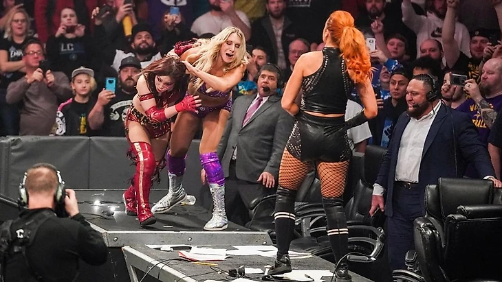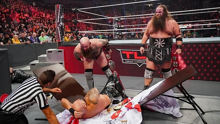 Надо отдать девушкам должное, ибо они старались. Самое обидное, что в мэйн-ивенте TLC год назад участвовали трое из четырех этих исполнительниц, и тот матч был прекрасен. Не идеален, но очень хорош. Этот вышел на порядок ниже. Понятно, что мы тут не ждали экшна уровня первых в истории TLC и идеальной техники, но у меня были самые высокие ожидания касательно боя, я был уверен, что он по праву займет место в мэйне и не подкачает. Не вышло. Дамы слишком много времени провели за пределами ринга, пытаясь убить друг друга и переходя от одного спота к другому, при этом не предпринимая никаких попыток дотянуться до титулов. А вот такие моменты с залезанием на лестницы и попытками сорвать пояса, во многом создают накал страстей, добавляют драмы поединку. Печально за Сэйн, ибо она очевидно была не в полном порядке, и многим показалось, что не очень уж вписалась в этот бой. Это было лучше, чем мэйн Survivor Series, но все-таки не уровень мэйн-ивента PPV. В общем, очень смешанные чувства. Причем, были хорошие фишки, были грамотные идеи, но реализовать это во что-то целостное, красивое, не получилось. Наверное, этот матч — это олицетворение всего TLC 2019: не то, чтобы совсем прям плохо, но все-таки достаточно слабенько.