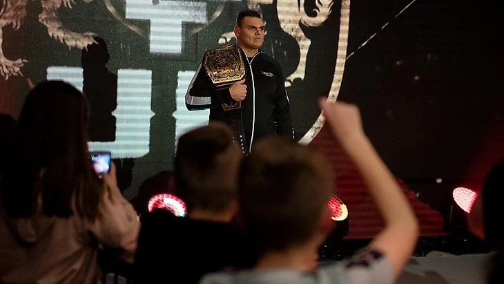 И после повторного анонса мэйн-ивента выпуска, который разделят между собой Илья Драгунов и Александр Вульф в матче без дисквалификаций, нас отправили к первому бою. И это была еще одна глава развития билд-апа другого известного нам специального шоу...