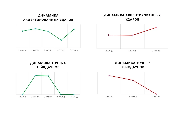 Динамика акцентированных ударов и точных тейкдаунов. Показывает в каком раунде боец выходит на свой пик по этим двум показателям.